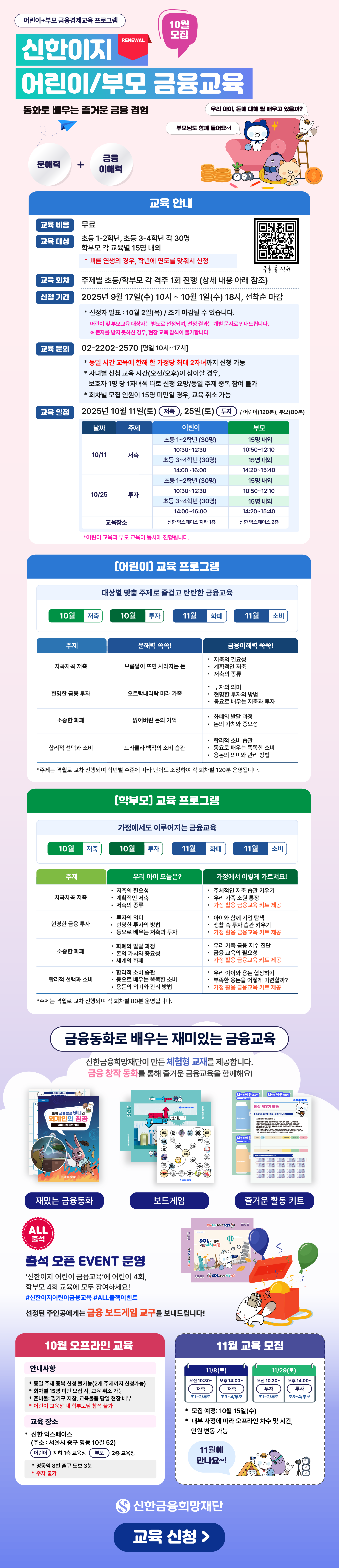 Home 공지사항 공지사항 신한이지(easy)에서 알려드립니다. (모집마감) 동화로 배우는 신한이지 어린이/부모 금융교육 10월 교육 모집 안내(9/17~10/1) 파일 없음 등록일 2025.09.17 조회수 1615