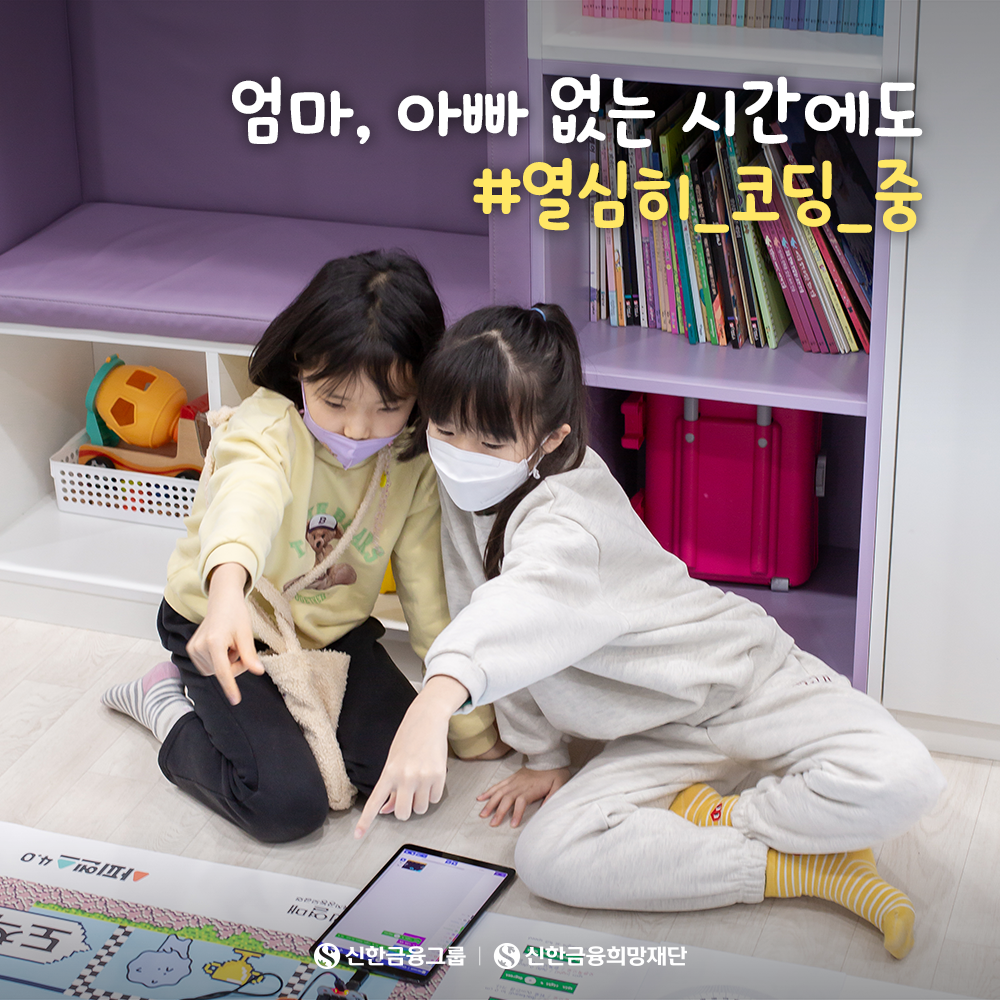 [희망레시피] 엄마, 아빠 없는 시간에도 #열심히_코딩_중 등록일 2024.01.18 조회수 5596 방과 후 육아 공백은 신한 꿈도담터에서 채울게요! 신한 꿈도담터는 맞벌이 가정 아이들의 공백 없는 성장을 위해 SW교육, 금융교육, 진로지도 등 다양한 활동을 지원하고 있습니다.